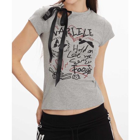 胸元にリボンをあしらい、ポップなプリントを組み合わせたガーリーなデザインTシャツ。遊び心がありカジュアルにもきれいめにも決まる一枚です。
