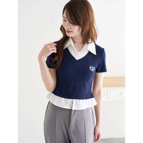 シャツにトップスをレイヤードしたようなドッキングデザインのこなれ見えシャツ。