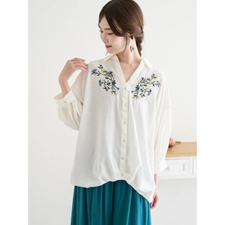 花モチーフの刺繍を胸にあしらったナチュラルガーリーな雰囲気のシャツ。