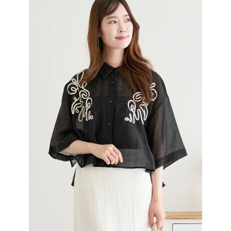 トレンド感のあるテープ刺繍を胸にあしらった大人可愛いシアーシャツ。
