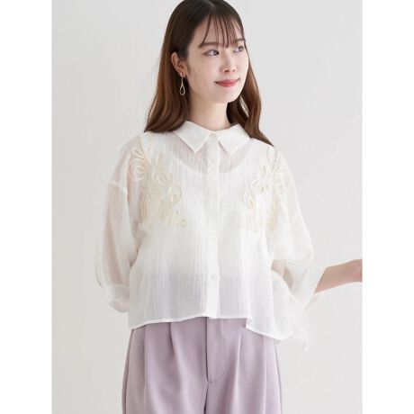 トレンド感のあるテープ刺繍を胸にあしらった大人可愛いシアーシャツ。