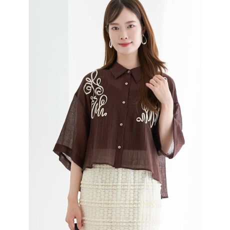 トレンド感のあるテープ刺繍を胸にあしらった大人可愛いシアーシャツ。