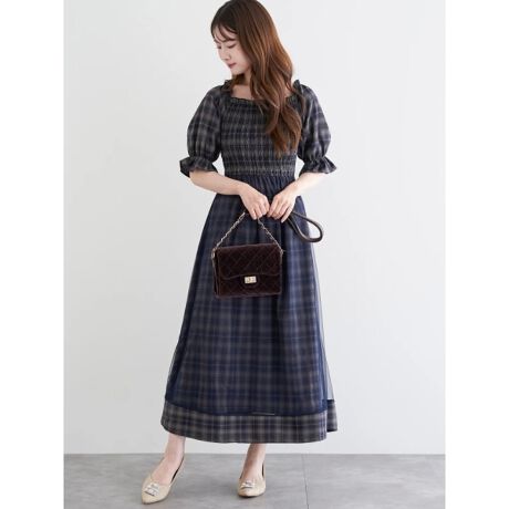 チェック柄×チュールシャーリングワンピース