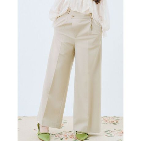 すっきりと美しいワイドシルエットが魅力の「LILY BROWN」のタックパンツ。アシンメトリーなウエストデザインに加え、ちらりと覗く飾りボタンが今季らしいモードなエッセンスを添えます。ウエスト裏にはマーベルトを配し、内側にさり気なくゴムを仕込むことで心地よくフィットする設計に。ベーシックでありながら、装いにひとさじの個性を加えてくれる一本です。