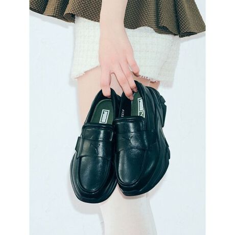 ハイキングシューズに着想を得たボリュームソールと、スマートなアッパーデザインを掛け合わせた、PUMAとのコラボローファー。シボ感と光沢のバランスが美しいフェイクレザーを使用し、「LILY BROWN」のクラシックなアイテムにもマッチするようアレンジしました。カーキのインソールがさりげなく上品さを引き立て、フロントのストラップにはエンボス仕様のプーマキャットロゴをオン。カジュアルにもフェミニンにも合わせやすい万能デザインです。