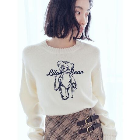 「LILY BROWN」オリジナルキャラクターのLILYBEARを、絵画のように繊細なタッチで刺繍したニットトップス。袖口と裾にはステッチ風の編み柄をあしらい、ディテールにも遊び心を添えました。優しい膨らみをもつシルエットと上品な雰囲気が調和し、プリーツスカートを合わせてトラッドに仕上げるスタイリングもおすすめです。