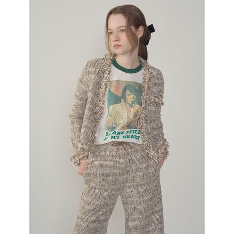 フリンジ使いが印象的なデザインで、華やかさとこなれ感を兼ね備えたツイードジャケット。カットソー素材で仕立てることで、通常のツイードに比べて軽やかでやわらかな着心地に。華奢なシルエットが美しく映え、カジュアルなスタイリングにも自然と馴染む一着です。