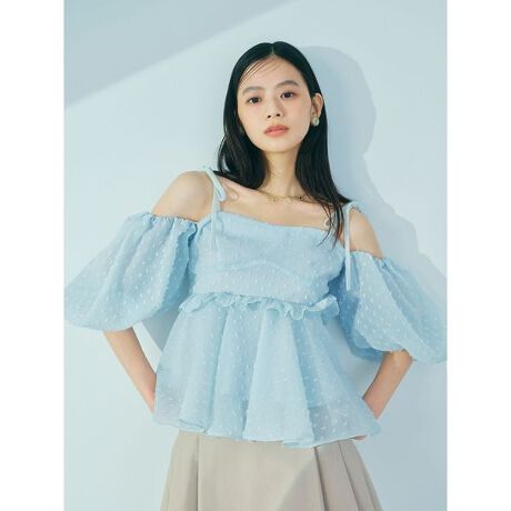 毎シーズン高い人気を誇るペプラムビスチェが、アップデートして今季も登場。胸下の切り替えにフリルを挟み込むことで、より一層フェミニンな印象に仕上げた一着です。肩にはベロア素材のリボンをあしらい、コーディネートのアクセントに。リボンはボタンで簡単に取り外し可能で、パフスリーブ・オフショルダー・キャミソールの3WAYで着こなしの幅が広がります。