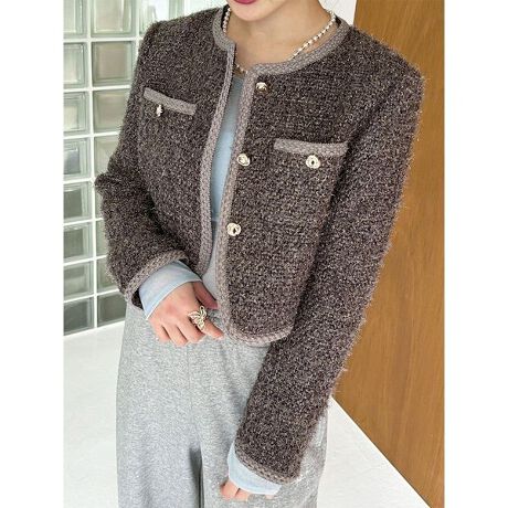 クラシカルな印象を引き立てるツイード素材を使用し、しっかりとした質感ながら柔らかな着心地に。季節の変わり目にも重宝する一枚です。