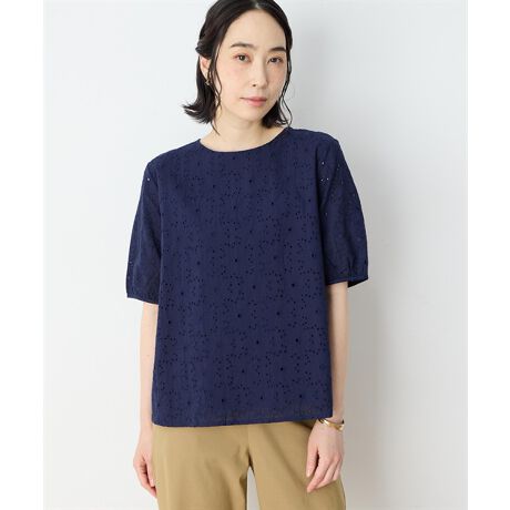 前身頃と袖を布帛の刺しゅう生地で切り替え、上品な華やかさをプラス。