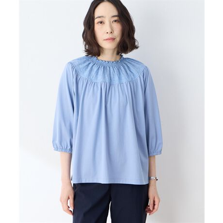 布帛の繊細な刺しゅう生地を襟と前後ヨークにあしらって、大人可愛いデザインに仕上げた1着。