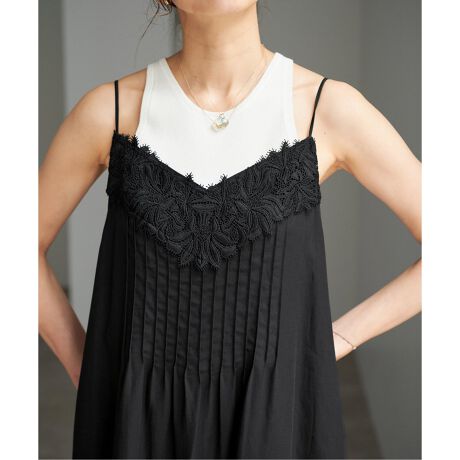 前後のピンタックとケミカルレースがアクセントのキャミソールワンピース。