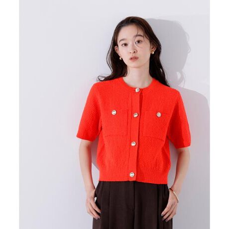 ゴールドカラー釦が映えるニットカーディガン。サマーツイードのような見え方で、どんなボトムスにもマッチします。クルーネックや胸ポケット付きで、きちんと感とカジュアルさのバランスが良いデザイン。すぐに着ることができ、これからの季節、長く活躍できます。<素材>凹凸感の出る糸を使用。表面感のある鹿の子編みのニットです。色によって表情が変わるパキっとしたカラーやカラーミックスの糸を使った編地も特徴です。<詳細>仕様・前ボタン裏地・なし透け感・なし / 光沢・なし / 伸縮性・あり生地の厚さ・普通※モデルの着用画像の場合、光の当たり具合により、実際の色味と異なって見えることがございます。色味は、商品単体の画像をご参照ください。