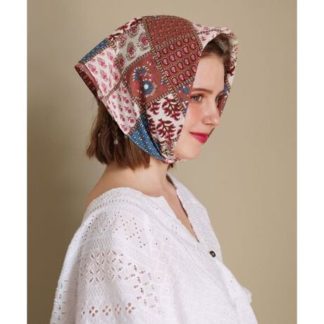 [型番:IRAP5203-2025]カラムカリやバグルのパッチワーク調な柄のバンダナ。ヘアバンドやリボンとして頭に巻いたり、バッグの持ち手などに巻いてアクセントに。アイディア次第でいつもと違う雰囲気に。マルチなシーンで日常を彩ります。
