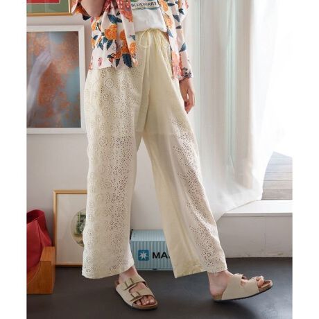 高見えするシフリー刺しゅうを大胆にあしらったストレートパンツ。刺しゅう部分が両サイドにありカッティングが特徴的なところがポイント。サイドポケットも付いていて、ウエスト調節可能。