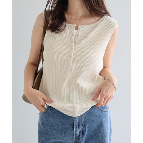 セルフカットリブ ヘンリーネック ノースリーブ トップス