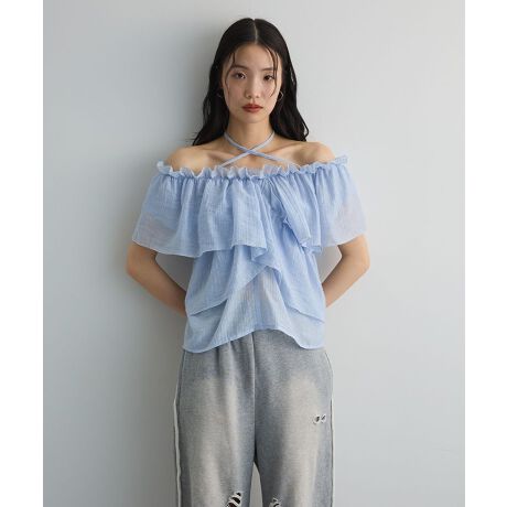 マルチウェイの着こなしが楽しめるオフショルダーブラウス。フリルをレイヤードして華やかさを出した立体的なシルエットが魅力的なデザインです。ショルダーストラップを調節してスタイルアレンジが可能。上品なシアー感と微光沢のある涼し気なテキスタイルで軽やかにご着用いただけます。