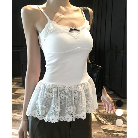チビリボンと裾レースのディテールがガーリーな印象のパッド付きキャミソール。