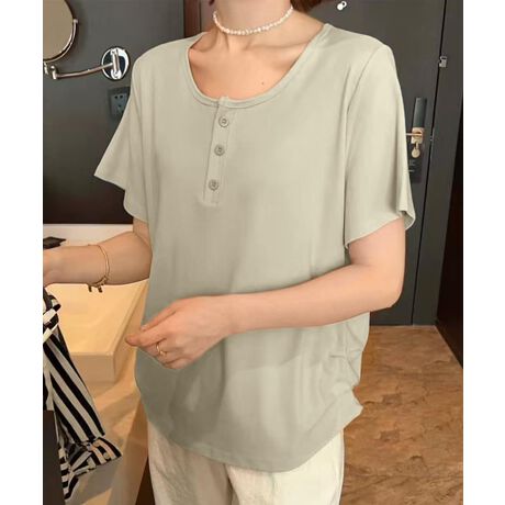 フロントにあしらわれたミニボタンがアクセントになった、ナチュラルな雰囲気のTシャツ。シンプルながらもディテールにこだわった一枚で、着こなしにさりげない変化を与えてくれます。