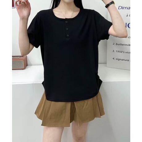 フロントにあしらわれたミニボタンがアクセントになった、ナチュラルな雰囲気のTシャツ。シンプルながらもディテールにこだわった一枚で、着こなしにさりげない変化を与えてくれます。
