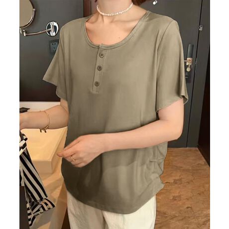 フロントにあしらわれたミニボタンがアクセントになった、ナチュラルな雰囲気のTシャツ。シンプルながらもディテールにこだわった一枚で、着こなしにさりげない変化を与えてくれます。