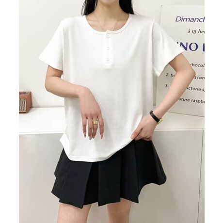 フロントにあしらわれたミニボタンがアクセントになった、ナチュラルな雰囲気のTシャツ。シンプルながらもディテールにこだわった一枚で、着こなしにさりげない変化を与えてくれます。