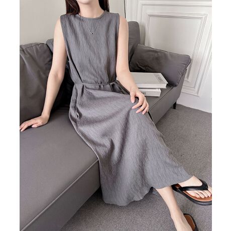 縮み生地の涼しげなノースリーブロングワンピース。ウエストリボンで自然なメリハリが出るのでゆったりした着心地でスッキリとしたシルエットに。ロング丈なので縦長ラインでスタイルアップ効果も抜群。柔らかい生地で肌触りが良く、上品かつ大人っぽい印象に。
