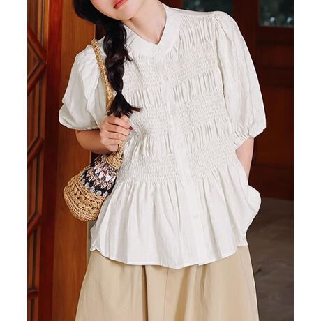 コットンギャザー半袖ブラウス シャーリングデザイン