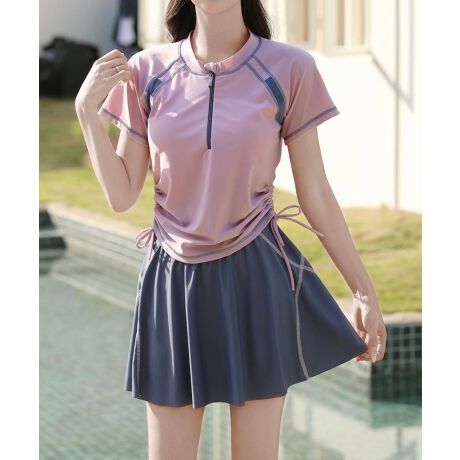 紫外線対策もばっちりな、ジップアップタイプのトップスとフレアスカートがセットになった、水陸両用セパレート水着。