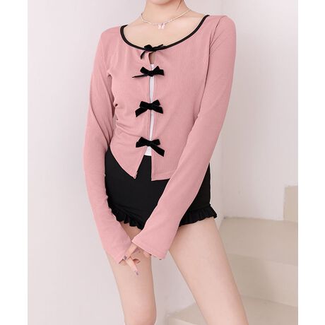 フロントに並んだ4つのベロアリボンが目を引く長袖トップスは、くすみピンクのリブ素材で可愛さも着心地も抜群。襟まわりとリボンのブラックパイピングが全体を引き締め、甘くなりすぎず大人っぽい印象に。