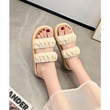 柔らかなシャーリングストラップが特徴の厚底サンダル。フェミニンでボリュームのあるデザインで足元を華やかに。