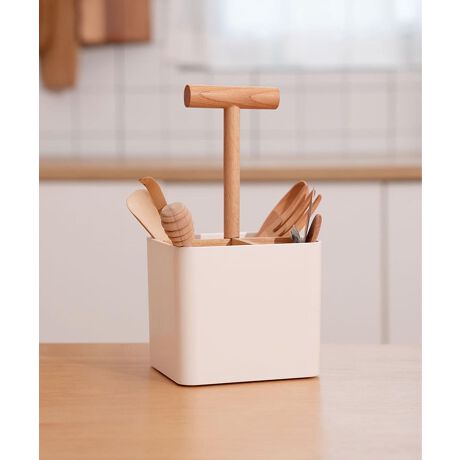 ナチュラルな木製ハンドルとシンプルなスクエアフォルムが特徴の収納スタンド。中央に仕切りがついているため、カトラリー、ブラシ、文房具などをきれいに分類収納できます。