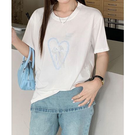 胸元の淡いブルーのハートロゴが印象的な半袖Tシャツ。ナチュラルなカラー展開で、どんなコーデにもなじみやすいデザインです。