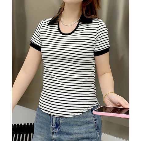 カジュアル感たっぷりのボーダーデザインに、襟元と袖口の配色がアクセントになったクルーネックTシャツ。コンパクトながら程よいゆとりがあり、体のラインを拾いすぎない着心地です。