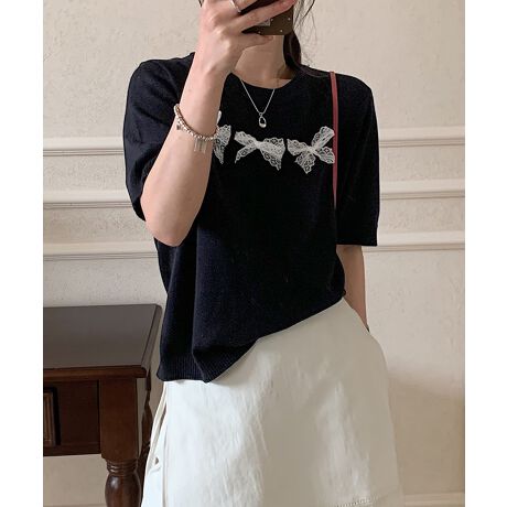 フロントに3つの立体リボンをあしらった、フェミニンさ際立つ半袖Tシャツ。シンプルながらもディテールにこだわったデザインが、甘すぎず上品な印象。