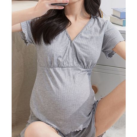 妊娠中のリラックスタイムにぴったりな、半袖トップスとショートパンツのルームウェアセット。柔らかなリブ素材がやさしく身体を包み込み、快適な着心地を提供します。