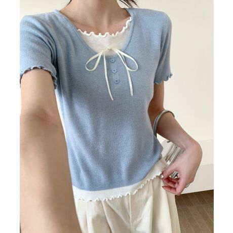 襟元のリボンと配色フリルがアクセントになった、ガーリーな印象の半袖ニットトップス。さりげない可愛らしさが詰まったデザインで、コーディネートに華やかさをプラスしてくれます。