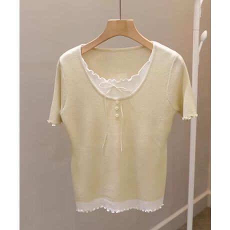 襟元のリボンと配色フリルがアクセントになった、ガーリーな印象の半袖ニットトップス。さりげない可愛らしさが詰まったデザインで、コーディネートに華やかさをプラスしてくれます。