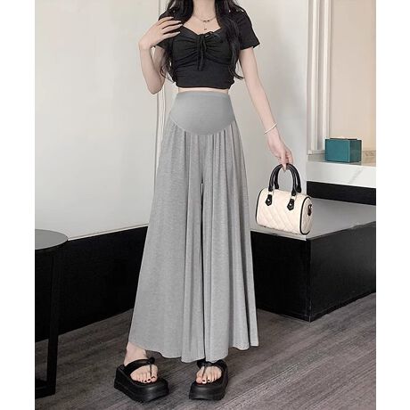 広がりのあるシルエットが美しい、マタニティ用ワイドパンツ。ハイウエストの腹部サポートデザインで、大きくなるお腹もしっかり支え、妊娠中も快適に着用できます。