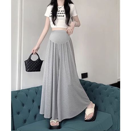 広がりのあるシルエットが美しい、マタニティ用ワイドパンツ。ハイウエストの腹部サポートデザインで、大きくなるお腹もしっかり支え、妊娠中も快適に着用できます。