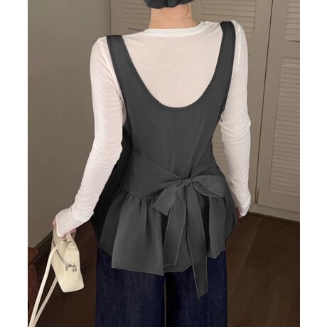 バックリボンデザインが可愛いフリルタンクトップ。やや透け感のある軽やかな素材で、夏らしい涼しげな印象に。ウエスト位置に添えた大きなリボンがアクセントとなり、360度どこから見てもフェミニンな魅力を引き出してくれます。