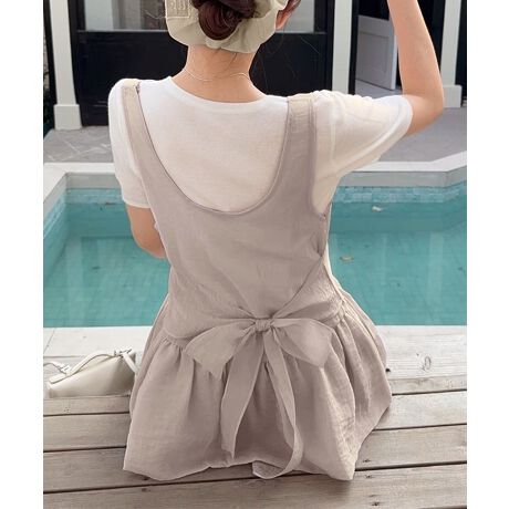 バックリボンデザインが可愛いフリルタンクトップ。やや透け感のある軽やかな素材で、夏らしい涼しげな印象に。ウエスト位置に添えた大きなリボンがアクセントとなり、360度どこから見てもフェミニンな魅力を引き出してくれます。