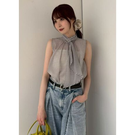 <b>【シアー素材にすっきりしたボウタイがモードな、ニュアンスあるノースリーブブラウス】</b>