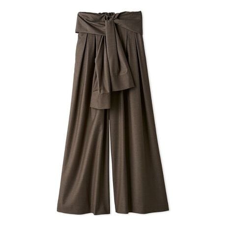 シャツを腰巻きしたようなデザインで、履くだけでこなれ感が演出できるタックワイドパンツ。