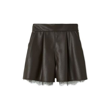 フェイクレザーのタック入りショートパンツに、レース付きのインナーパンツを組み合わせた、こなれ感のある一枚。