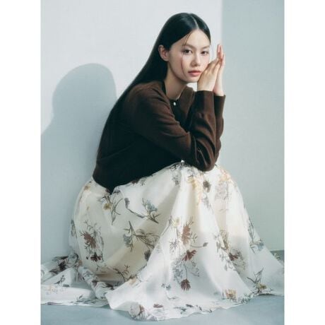 <b>【ほんのりシアーな素材にオリジナルのボタニカル柄が映える、タックフレアスカート】</b>