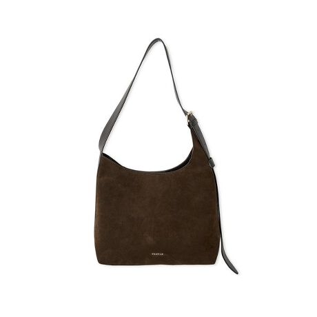 アシンメトリーな口元と、ベルトのようなバックル付きの持ち手が印象的な、ホーボーバッグ。