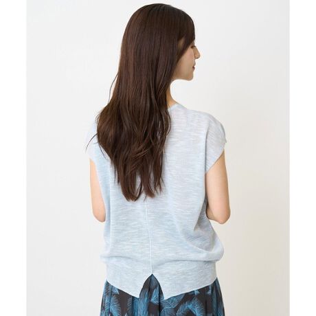 後ろ中心の裾にスリットを入れたデザインはボトムを問わずインせずに簡単に決まります。さらに後ろに細いピンタックのディティールが入ることで後ろ姿もきれい見え。ラメ感はほんのりになるので、お仕事などのオンシーンにも着こなしやすいのも嬉しい。