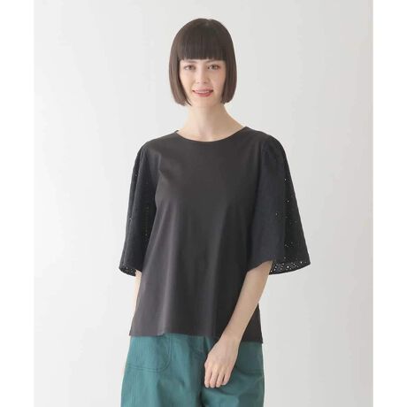 アイレットレースの立体的なフレアスリーブがトレンド感あるデザイン。身頃はあえてシンプルにすっきりと仕上げた大人エレガントな華やかさが魅力です。ゆったりめのフォルムとボトム合わせしやすい丈感で普段使いに重宝する着回し力の高いアイテム。お持ちのアクセサリーをプラスしてお好みのスタイリングに。