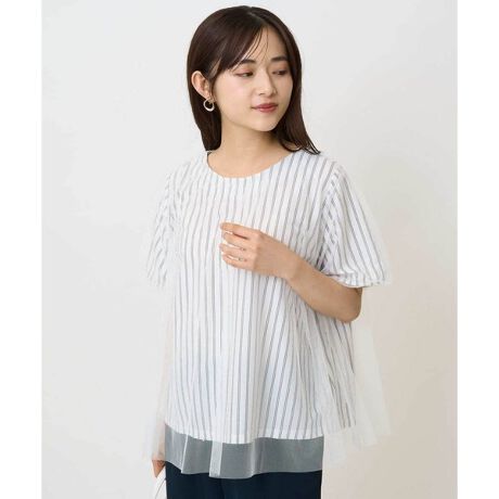 細めのストライプに薄手のチュールを重ねたプルオーバー。衿ぐりの詰まった後ろ釦開きのデザインで、セットインスリーブのフレアーシルエットに。ギャザーの入ったチュールが軽くやわらかな印象に。